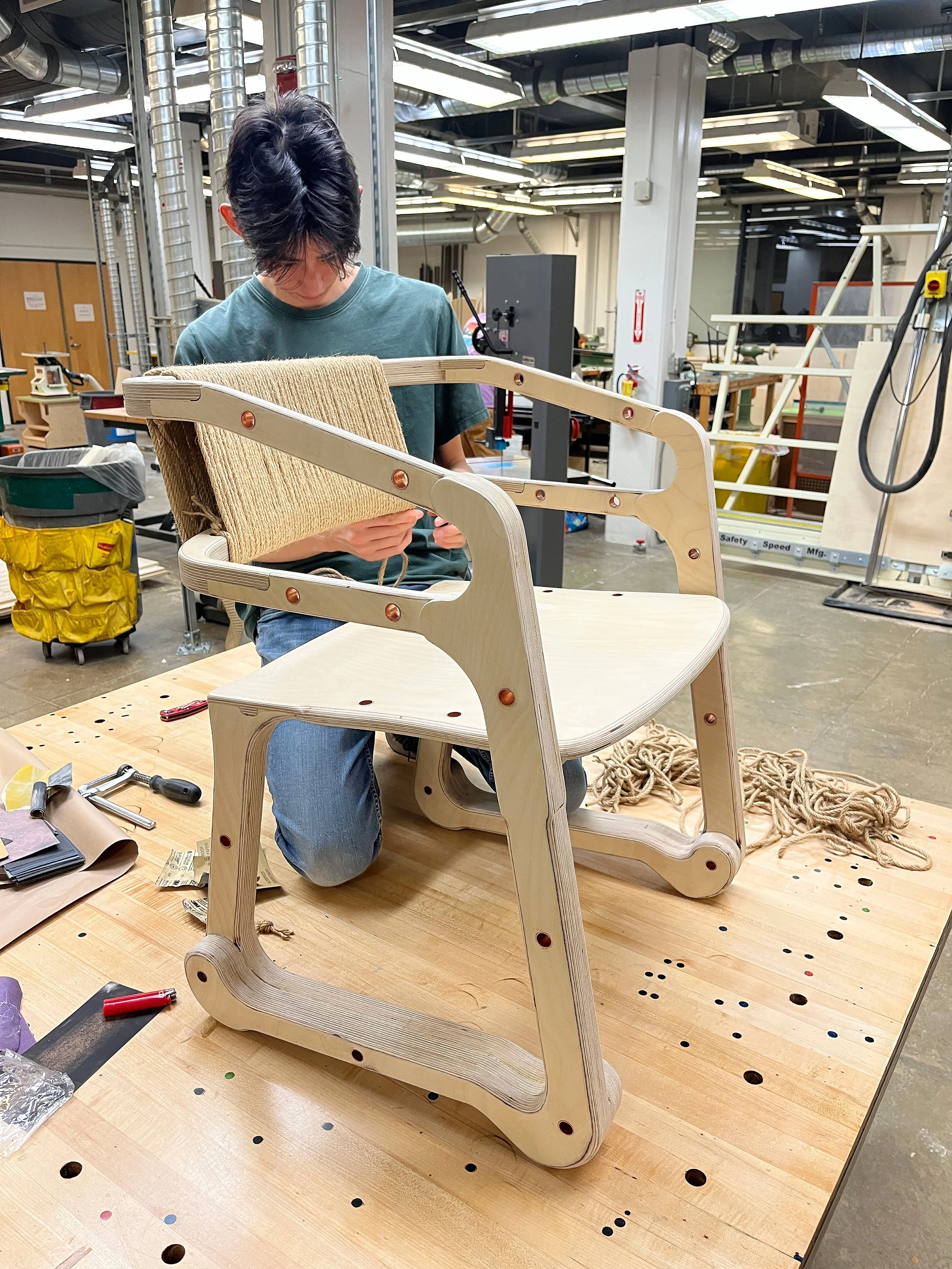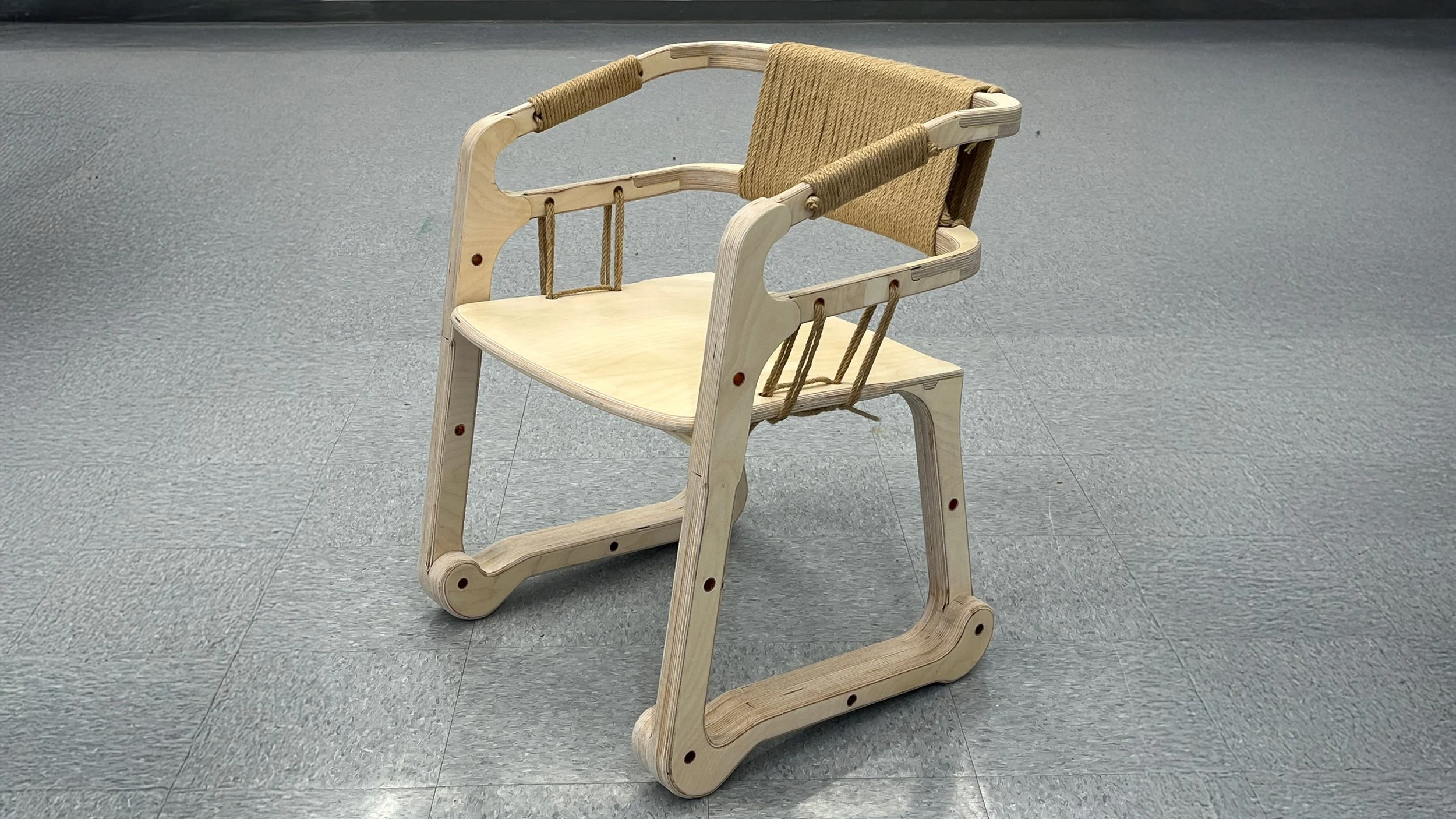 This project involved designing and building a full-size chair CNC cut from a single 4x8ft sheet of plywood, with the central visual concept being the illusion of a suspended seat. The joinery was custom designed to hide all dogbones and create a continuous, flowing form, while copper pipe detailing and nearly 300 feet of woven cord served as both structural anchor points and decorative elements. The primary challenge was ensuring every joint lined up correctly so the chair could actually be assembled, which required careful planning of the assembly sequence to leave as much time as possible for adjustments and added detail. Designing convincing curves from flat CNC cut pieces, cleanly fitting the copper piping into the form, and keeping all dogbones out of sight rounded out the key construction problems solved throughout the project.