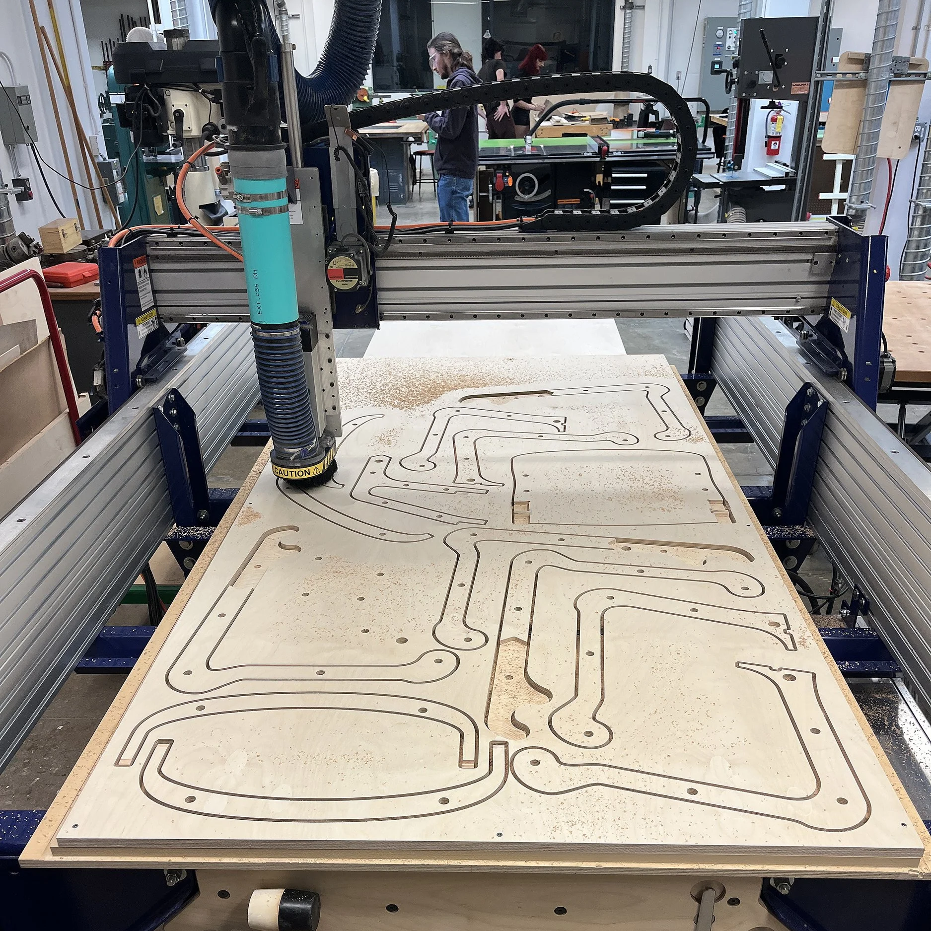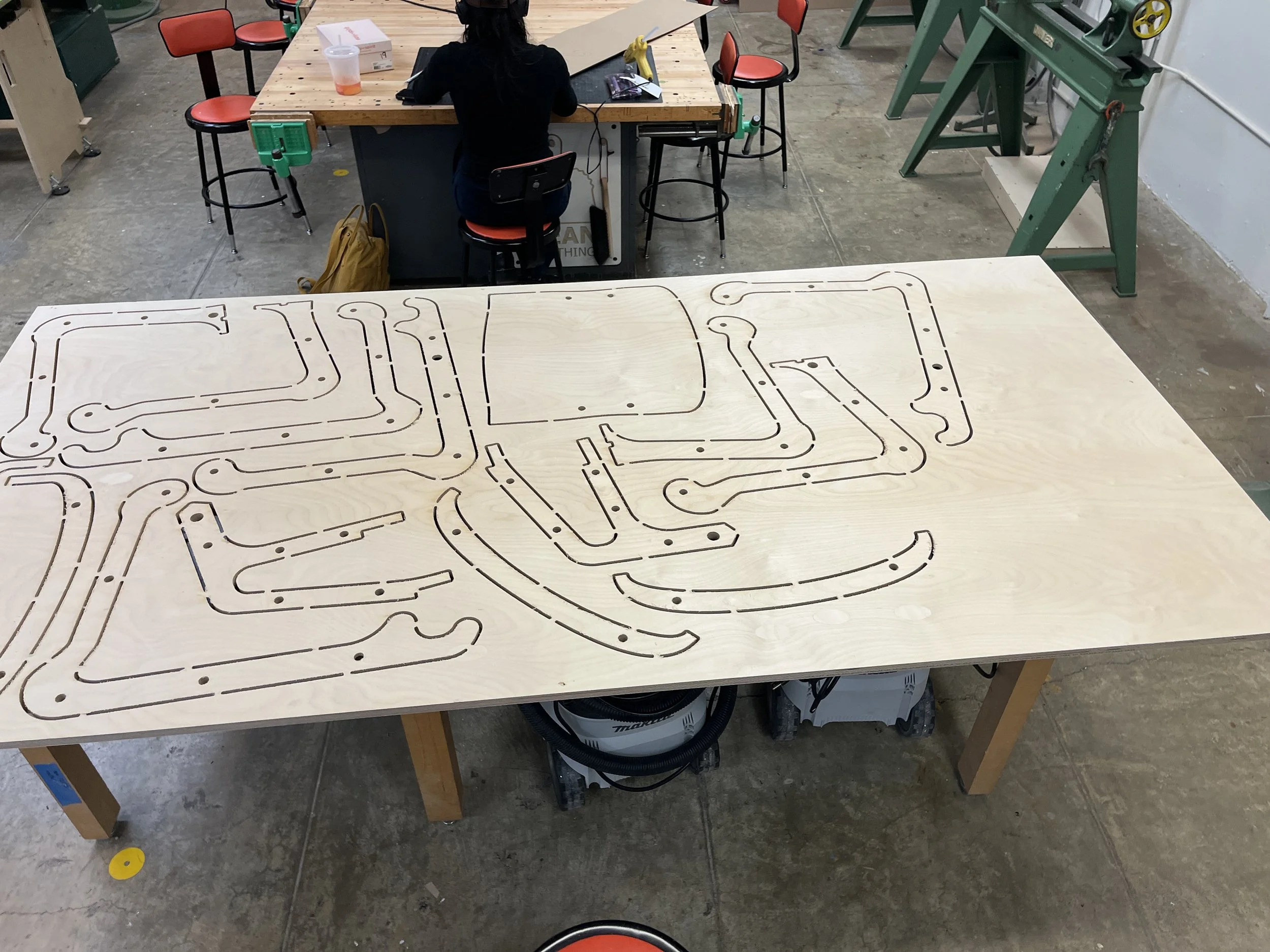 After the final 3D model was made, a CAM file was used to cut out the entire chair out of an standard 4X8 ft AB grade plywood sheet.