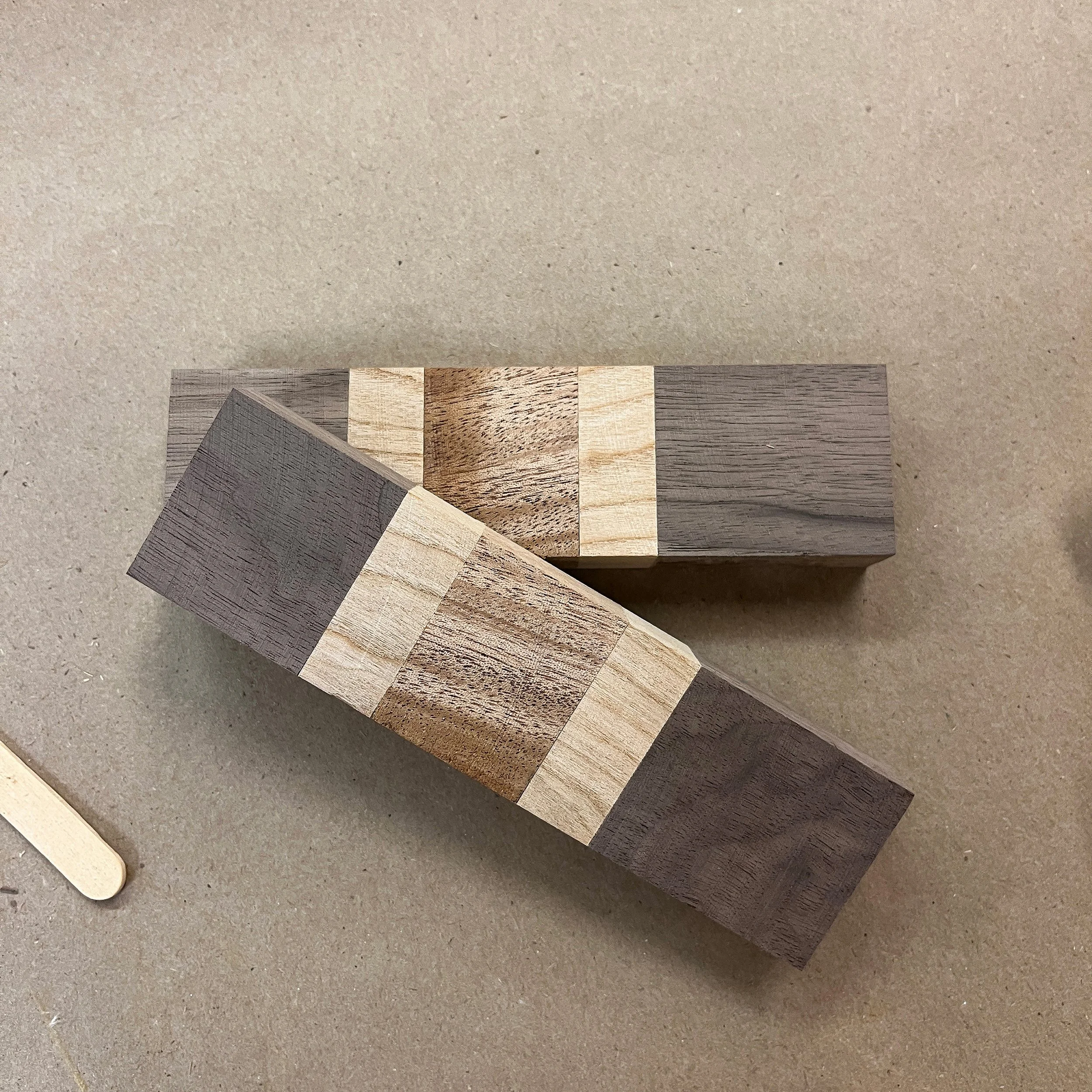 Walnut, cherry, and mahogany were chosen for their contrasting tones and laminated in alternating bands. Walnut was placed at both ends for its hardness and impact resistance, with cherry and mahogany filling the center for visual contrast.