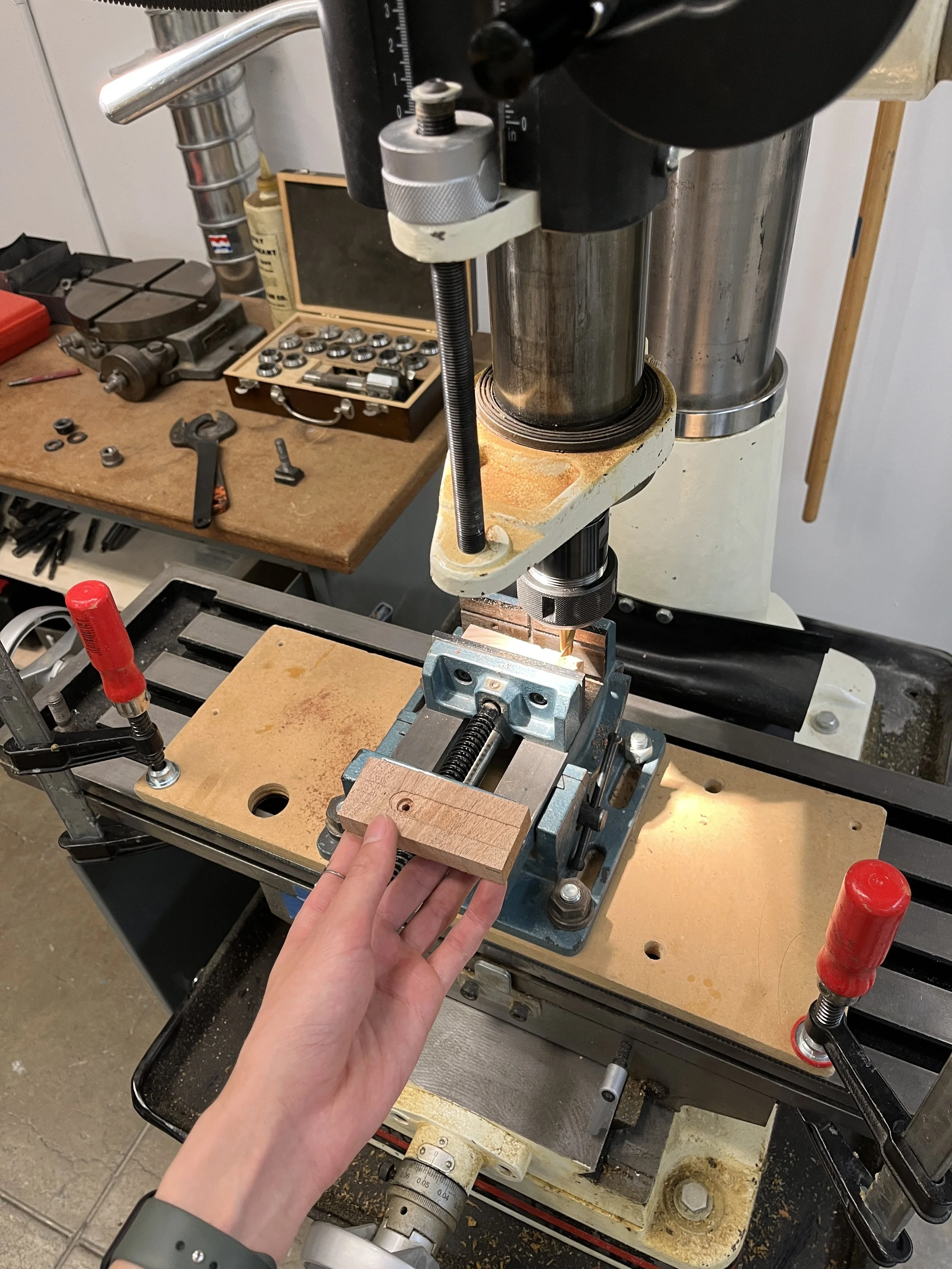 The drill press was then used to add a hole for the post screw meant to secure the blade.