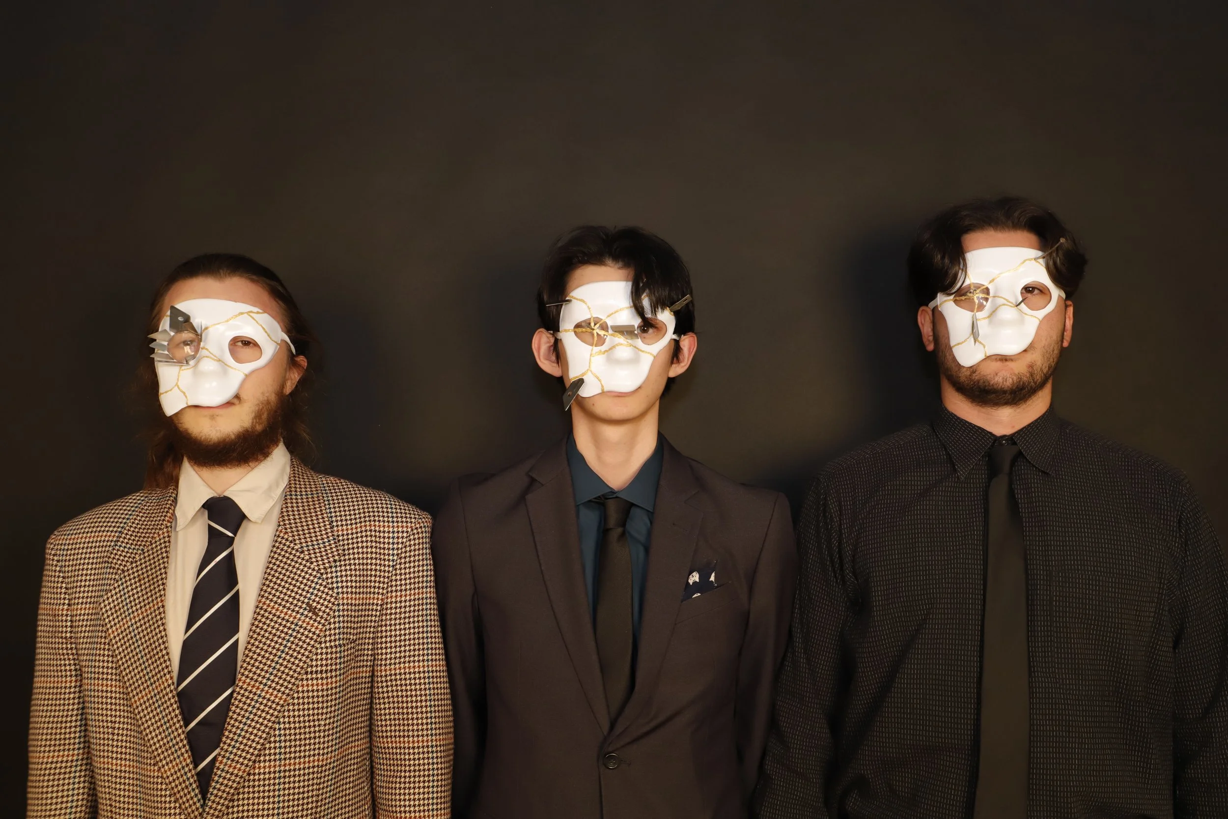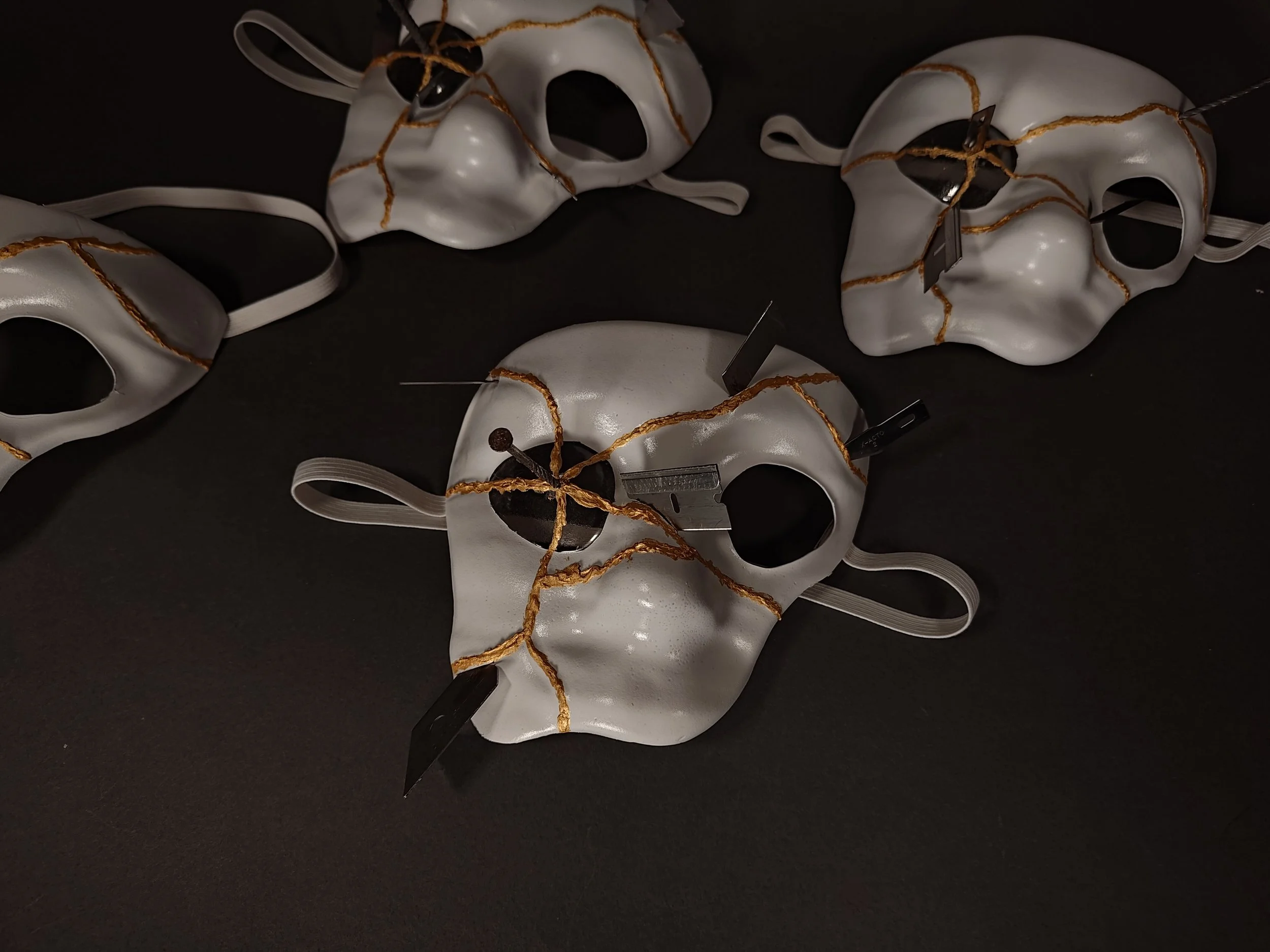 The finished masks are embedded with the razorblades and metal hardware, all following the gold cracks, focusing in on the lens in front of the eye.