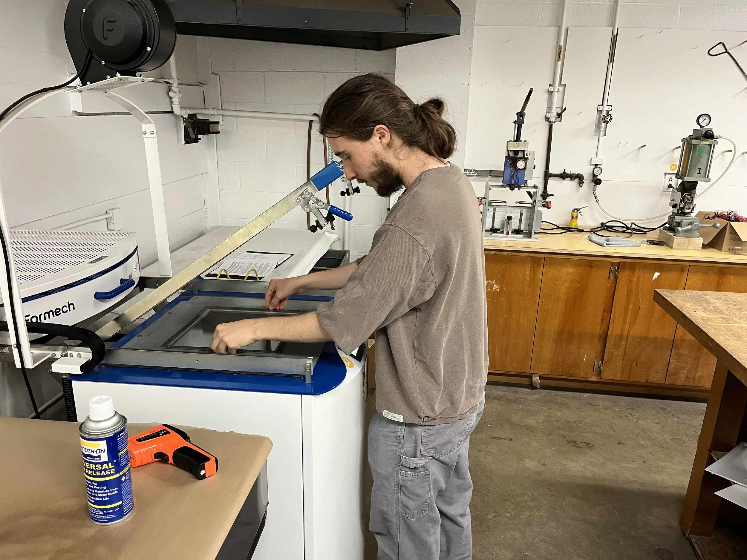 The mask’s master model was made out of HDPE foam. A material that is easy to machine and shape, as well as having high enough heat resistance to withstand the vacuum forming process.