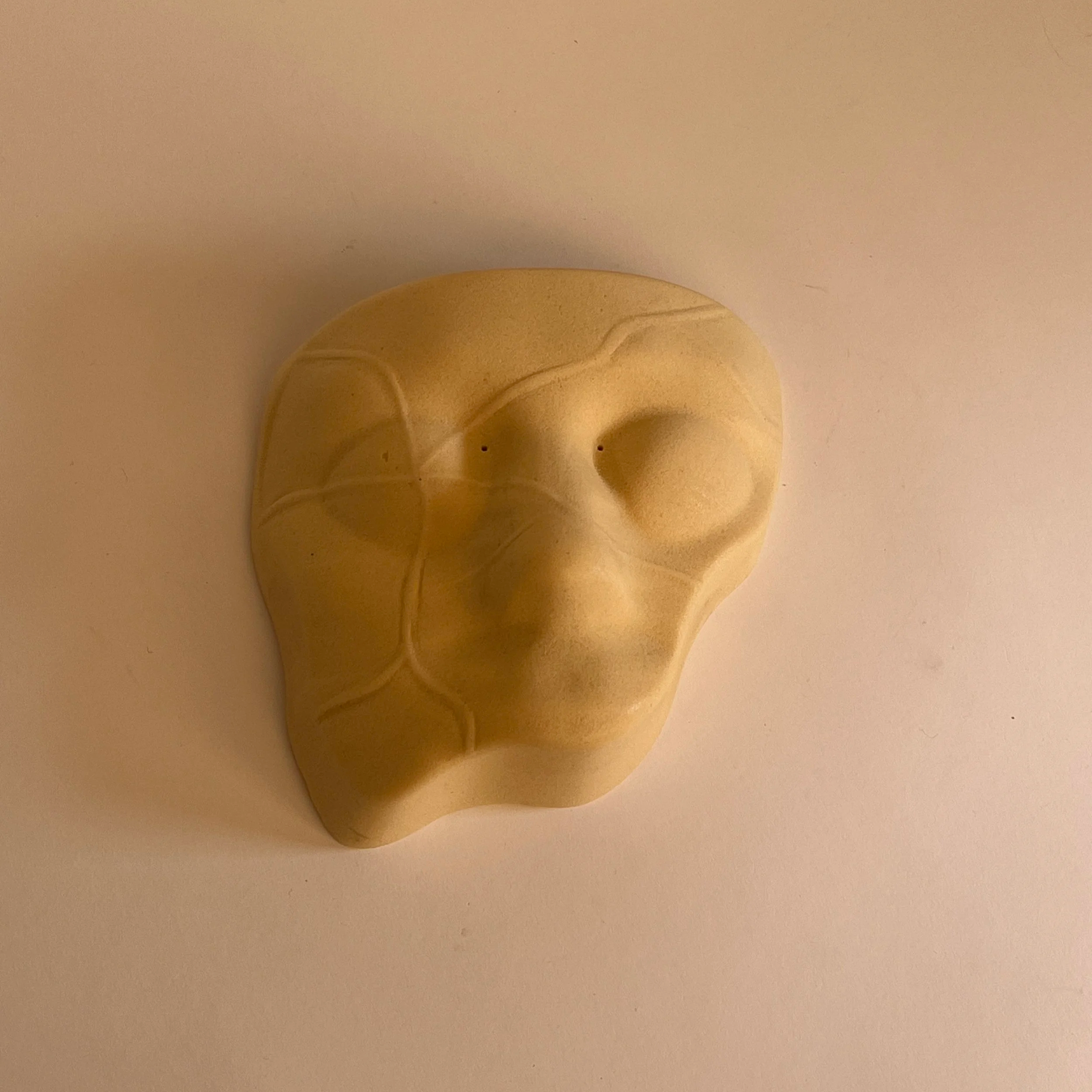 The mask was spray painted white with the eye was masked off to preserve the polycarbonate's clarity. The crack details were then hand painted using a thick acrylic gold, building up a chunky, glossy texture that catches the light along the cracks.